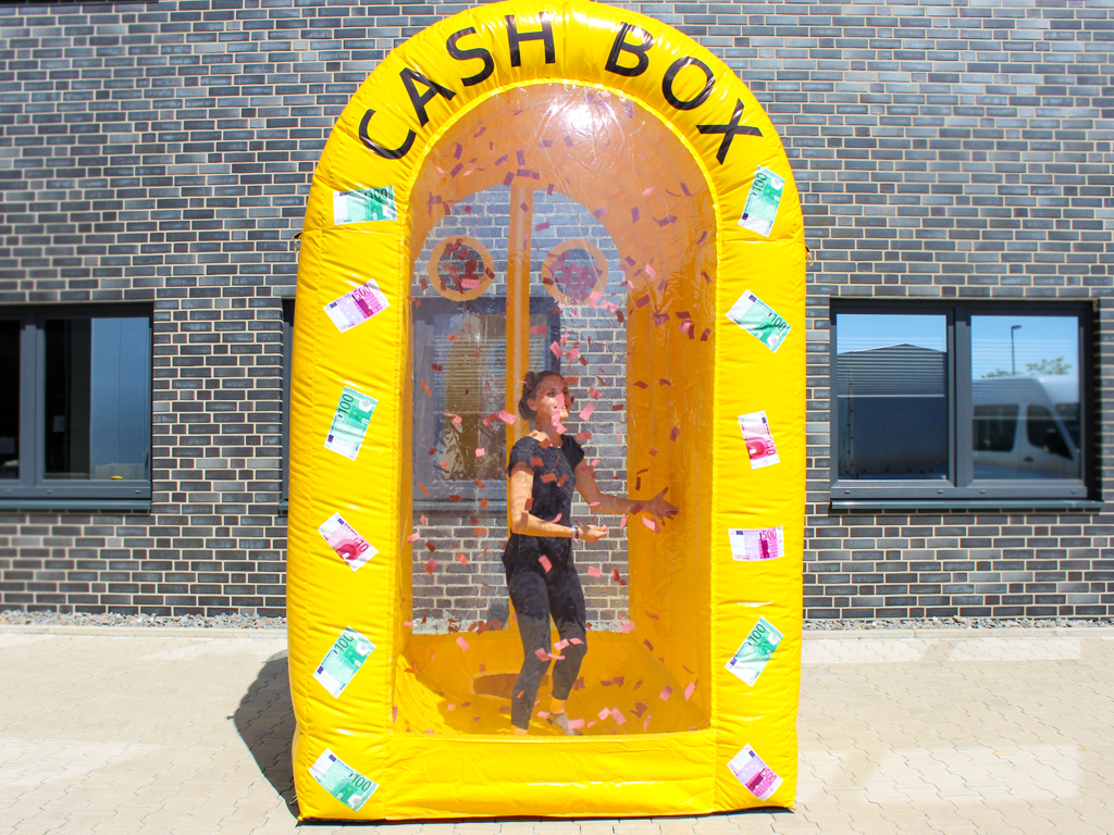 Die Cashbox – Wirbelbox bringt Spannung und Nervenkitzel auf dein Event. In dieser durchsichtigen Box wirbeln Scheine, Gutscheine oder kleine Preise umher, während die Teilnehmer versuchen, so viele wie möglich zu fangen. Die Herausforderung besteht darin, die Preise im Chaos des Wirbels zu ergreifen, bevor die Zeit abläuft. Diese actionreiche Attraktion sorgt für jede Menge Spaß und zieht die Aufmerksamkeit der Gäste auf sich. Ideal für Messen, Firmenfeiern und Promotions, bietet die Cashbox ein unvergessliches Erlebnis, das sowohl Geschicklichkeit als auch Schnelligkeit erfordert.