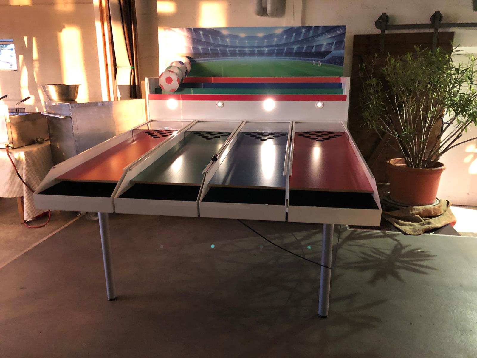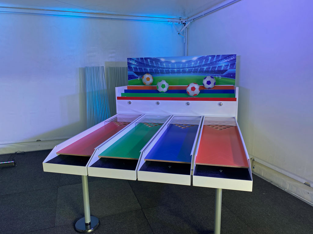 Das Derbyrennen Fußball bringt den Nervenkitzel eines Fußballspiels im Miniaturformat auf dein Event. In diesem aufregenden Wettkampf steuern die Teilnehmer kleine Fußballspieler, die um die Wette rennen, um den Ball ins Tor zu schießen. Ideal für Fußballfans und sportliche Herausforderungen, bietet dieses Modul eine unterhaltsame und interaktive Möglichkeit, Gäste auf deinem Event zu begeistern. Egal ob für Firmenfeiern, Messen oder private Partys, das Derbyrennen Fußball sorgt für spannende Momente und einen hohen Spaßfaktor.