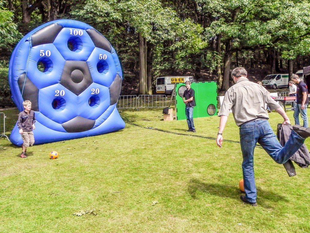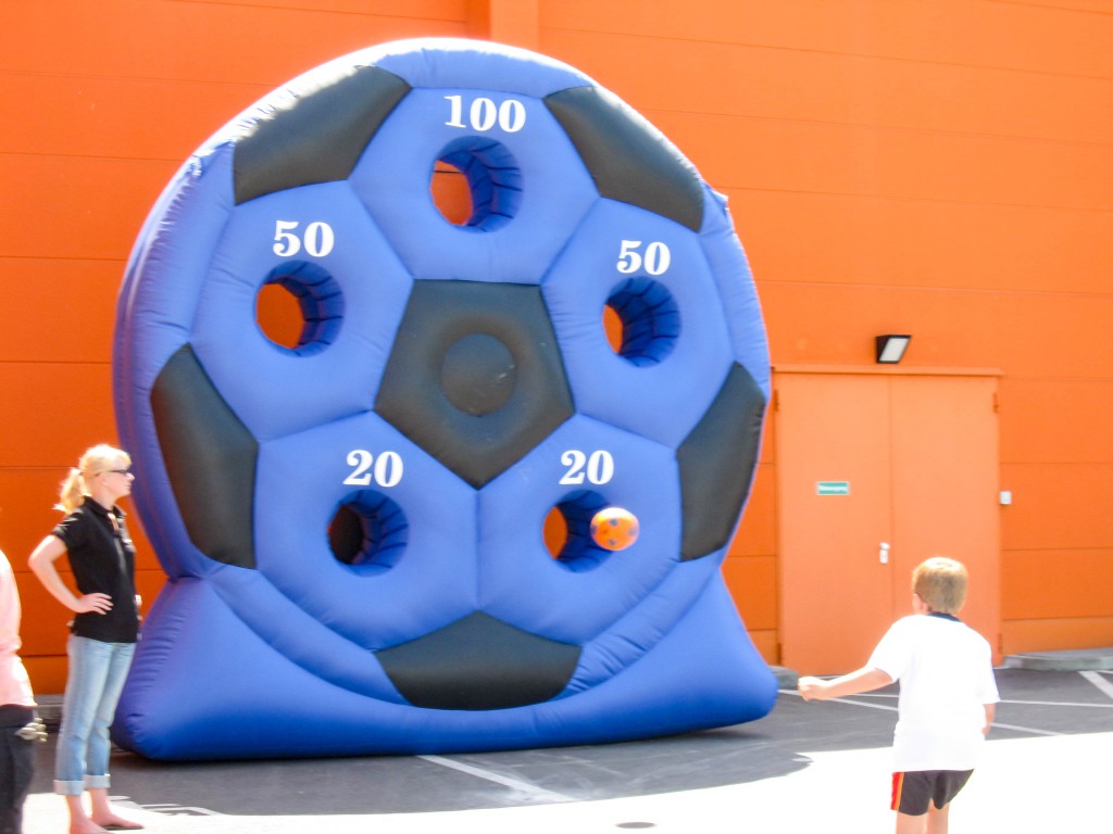Das Runde muss ins Runde … oder wie war das? Platziere den Ball in den Löchern mit unserem Fußballrad. Dafür erhalten deine Gäste unterschiedliche Punkte. Ein sportlicher Wettkampf für Fußballfreunde und eine tolle Alternative zum klassischen Fußball. Das Fußballrad ist eine luftgefüllte, runde Torwand mit fünf Löchern, die unterschiedlich viele Punkte geben. Belohne besondere Treffsicherheit mit kleinen Preisen oder Give-aways. Der Einsatz auf Schotter- oder Ascheplätzen ist leider nicht möglich.