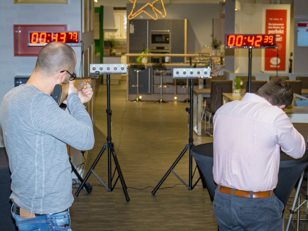 Auch ohne Schnee und Kälte lassen sich hier die besten Schützen messen. Schieße wie die Profis bei der beliebten Wintersportart Biathlon mit einer professionellen Trainingsanlage. Fünf Zielpunkte sind möglichst schnell und mit wenigen Versuchen zu treffen. Die Schützen durchlaufen zwei Durchgänge – einen im Sitzen und einen im Stehen. Der treffsicherste und schnellste Schütze gewinnt den Wettkampf. Ein gutes Auge und Genauigkeit sind hier besonders gefragt. Ob im Duell oder im Einzelversuch – diese Aktion ist ein wahres Erlebnis für alle Besucher:innen auf deinem Event.